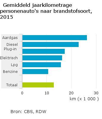 Heerlijk nieuws natuurlijk. De ‘groene’ automobilisten die voor een volledig elektrische auto of plugin-hybride kiezen, rijden veel meer dan de collega’s met een vuile plofmotor op benzine. Niets van gelogen ook. Hiernaast de CBS-grafiek over de gereden kilometers in 2015, uitgesplitst naar aandrijving. Auto’s op aardgas reden gemiddeld ruim 26.000 kilometer, diesels een goeie 23.000 en daarna volgen de plugins en de full-electrics met respectievelijk 17.400 en 16.300 kilometer per jaar.