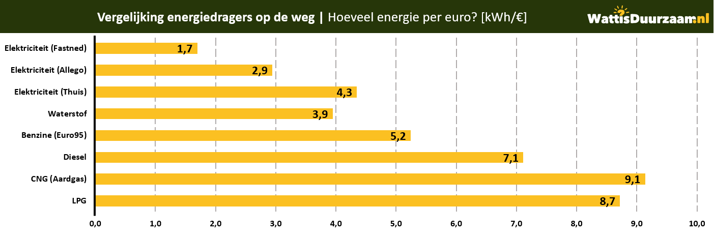 Als we puur kijken naar energie voor je geld, zien we dat laden eigenlijk altijd duurder is dan tanken. Alleen met eigen laadpaal is elektrisch rijden net iets voordeliger dan tanken voor waterstofpioniers. Het gat met benzine, diesel, LPG en CNG is enorm.