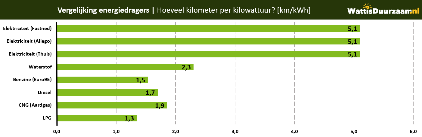 Kijken we niet puur naar energie dan is de glimlach bij de slimme automobilist snel weer terug. Hét voordeel van een elektrische auto is zijn efficiëntie. Gemiddeld over 13 modellen rijdt een elektrische auto in de praktijk zo’n 5,1 kilometer per kWh, met uitschieters tot boven de 6 km/kWh.