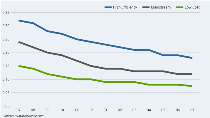 Na een korte en bescheiden opleving in 2020 en 2021 heeft traditionele kostprijsdaling voor zonnepanelen de afgelopen jaren weer sterk doorgezet, onder meer door overcapaciteit in China. Zonnepanelen kostten in juli 2024 volgens PVxchange nog slechts 7,5 tot 18 eurocent per wattpiek, voor respectievelijk de aller goedkoopste tot best presterende panelen. Dat is dus nog slechts enkele tientjes per paneel. Daar is ook met een flinke pot Amerikaanse subsidie moeilijk tegenop te concurreren.