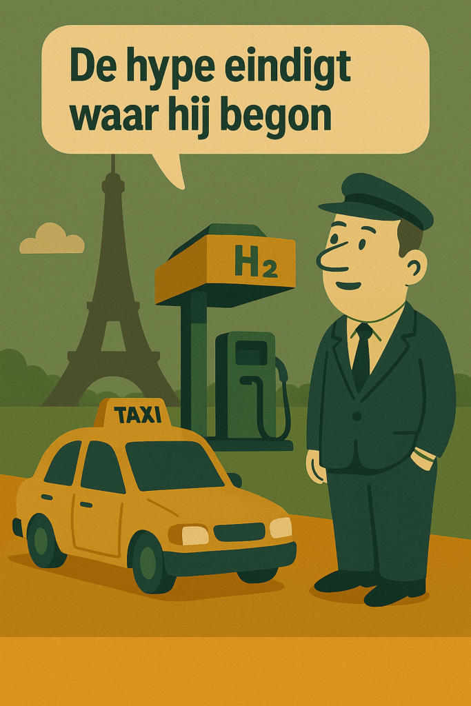 Ondanks de ook in Frankrijk gigantische ambities voor de productie van groene waterstof is daar ook in Frankrijk nog niets van terechtgekomen. Dat betekent dat de taxi’s van Hype na 10 jaar nog steeds op fossiele waterstof rijden.