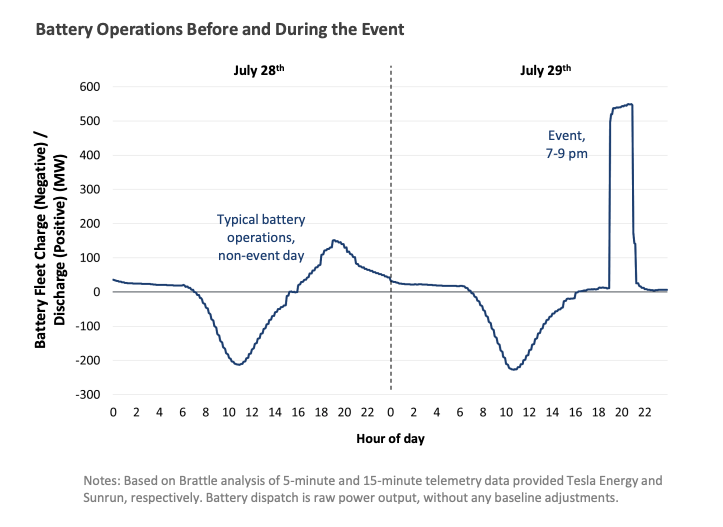 In de staat zijn sinds 2022 vraagsturingsprogramma’s actief die consumenten met thuisaccu’s en andere flexibele verbruikers financieel stimuleren om bij te dragen aan de balans op het elektriciteitsnet. Naar schatting 700 MW aan geïnstalleerde thuisaccu’s zijn aangemeld. Een goeie driekwart daarvan reageerde dus zoals beoogd, zie de grafiek onderaan dit bericht.