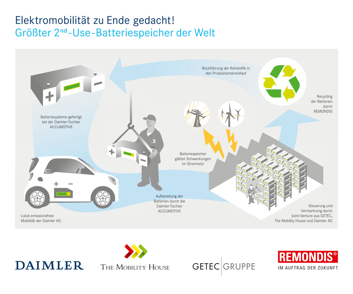 Volgens Daimler verdubbelt het directe hergebruik van de accupakketten de economische waarde van deze dure componenten. Ook verlaagt de verlengde gebruiksduur de ecologische voetafdruk van de accu’s. Als de systemen ook voor het niet-mobiele verbruik zijn afgeschreven, gaan de accu’s naar projectpartner Remondis voor recycling. Daimler heeft het second-life battery-project gerealiseerd samen met de Duitse opslagspecialist The Mobility House en energiedienstverlener Getec. The Mobility House bouwt in Nederland het accusysteem dat de energievoorziening in de Amsterdam Arena veiligstelt.