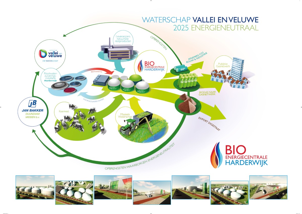 De Bio-Energiecentrale Harderwijk is een project van agrarisch dienstverlener Jan Bakker en Waterschap Vallei en Veluwe. “Afval is geen afval meer, maar grondstof”, zegt Tanja Klip-Martin, dijkgraaf van het Waterschap. “Dat is volgens ons nog de enige juiste benadering.”